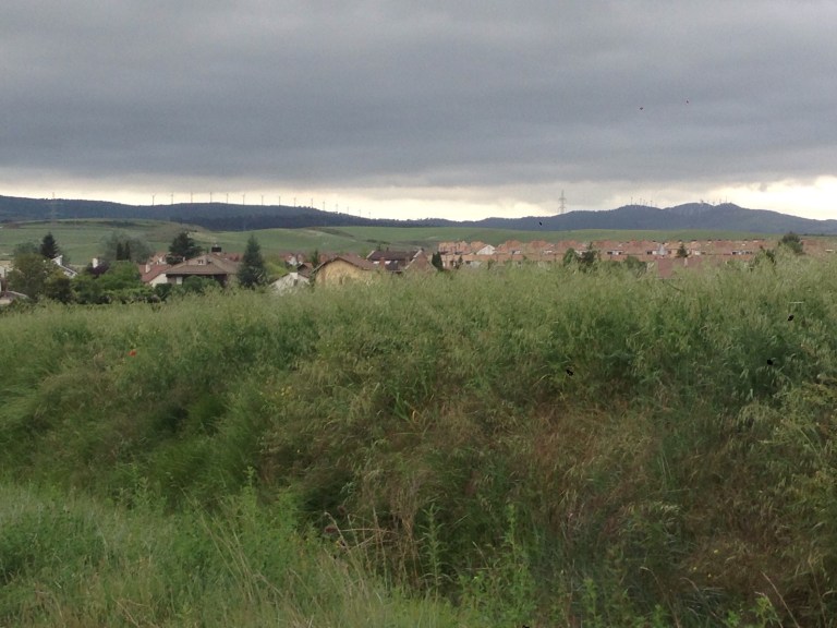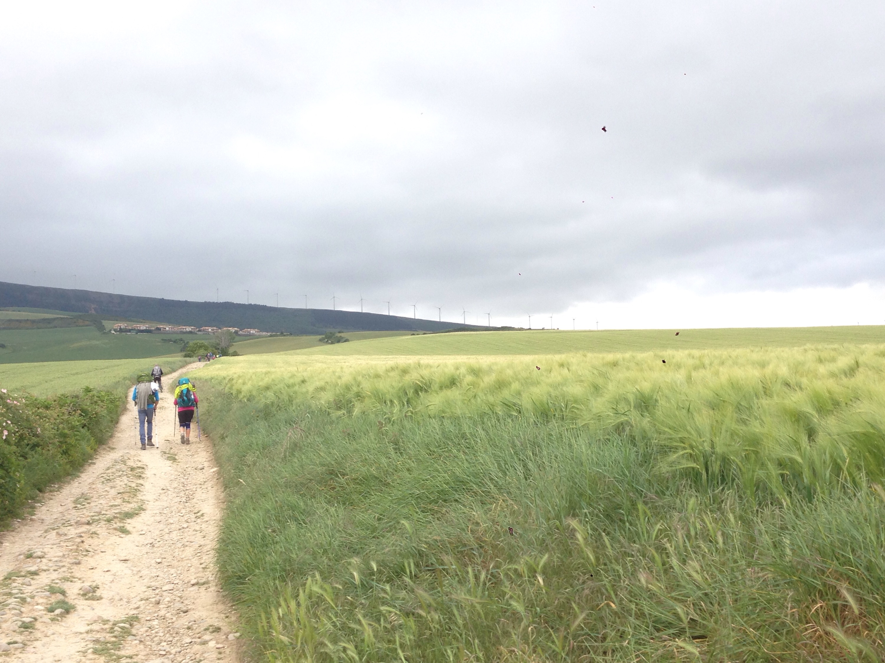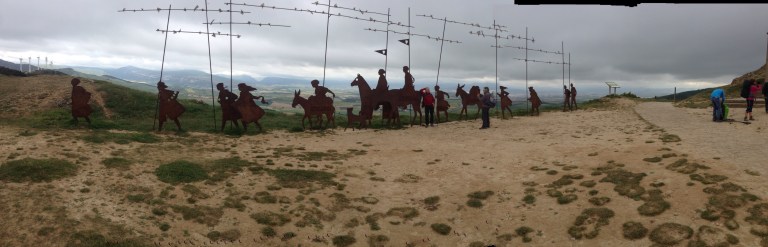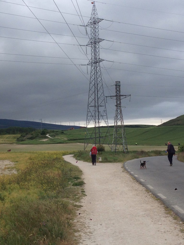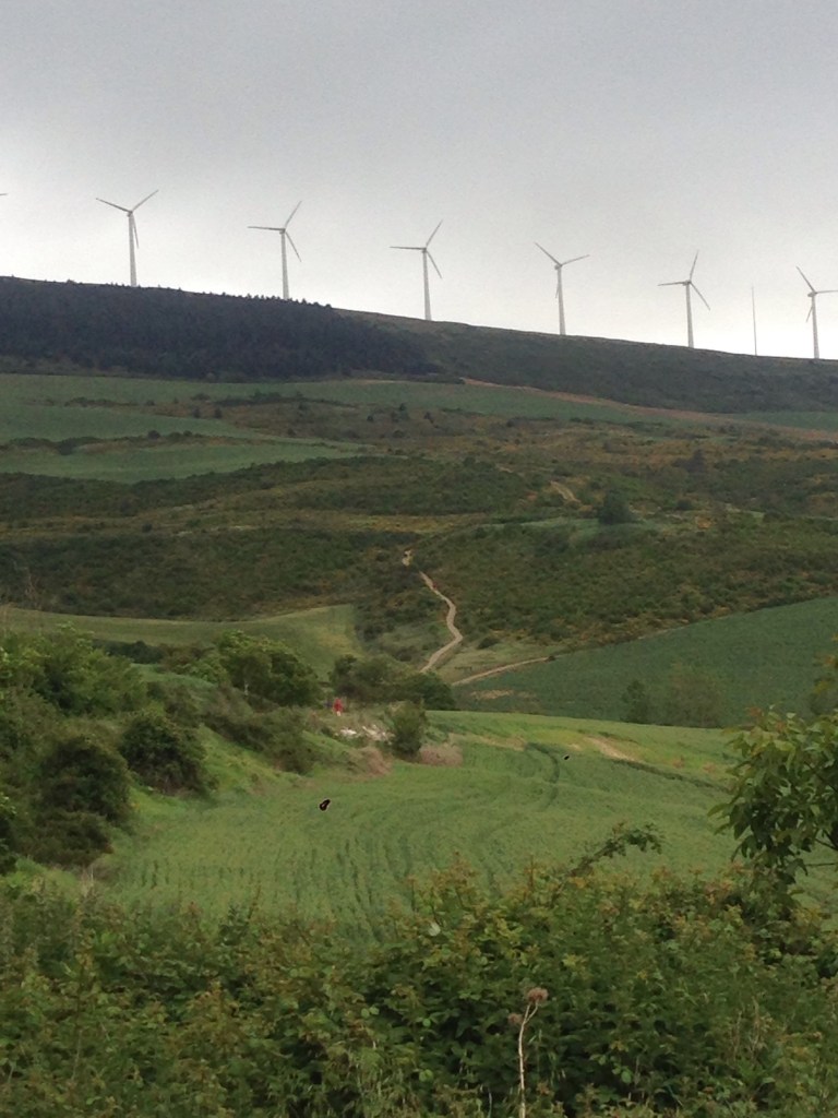 Highlight of the day was the metal statues of pilgrims on the ridge with the line of wind turbines.