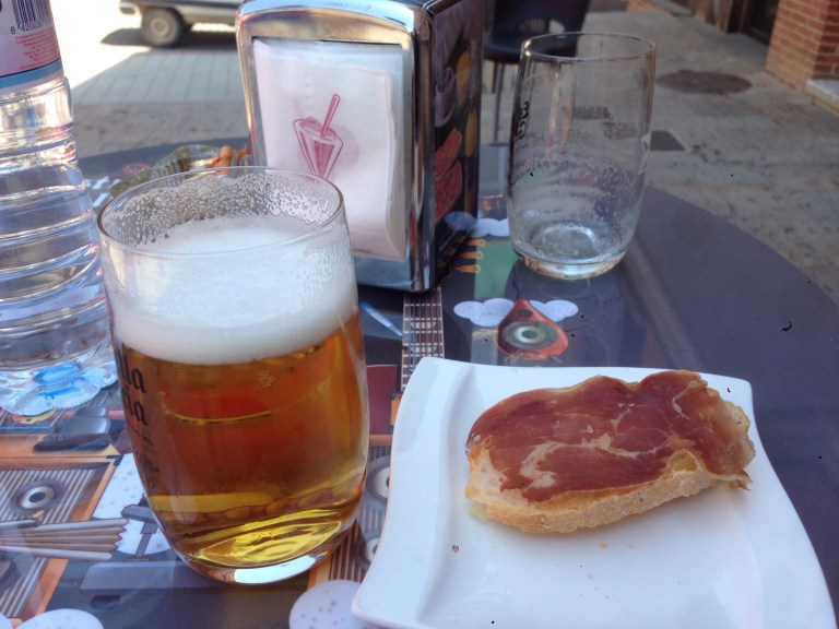 Had plenty of time, after checking in and shower, to wander. Stopped for a little refreshment as it was so hot. Had a cerveza – only cost one euro . And they brought me out this tapas. Reminded me I was a little peckish so had another beer (and tapas).