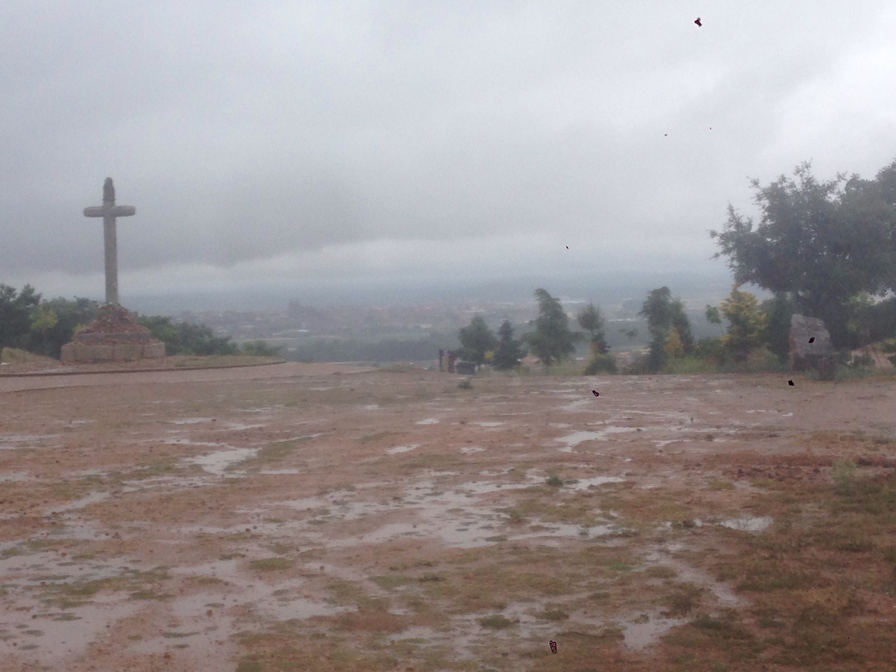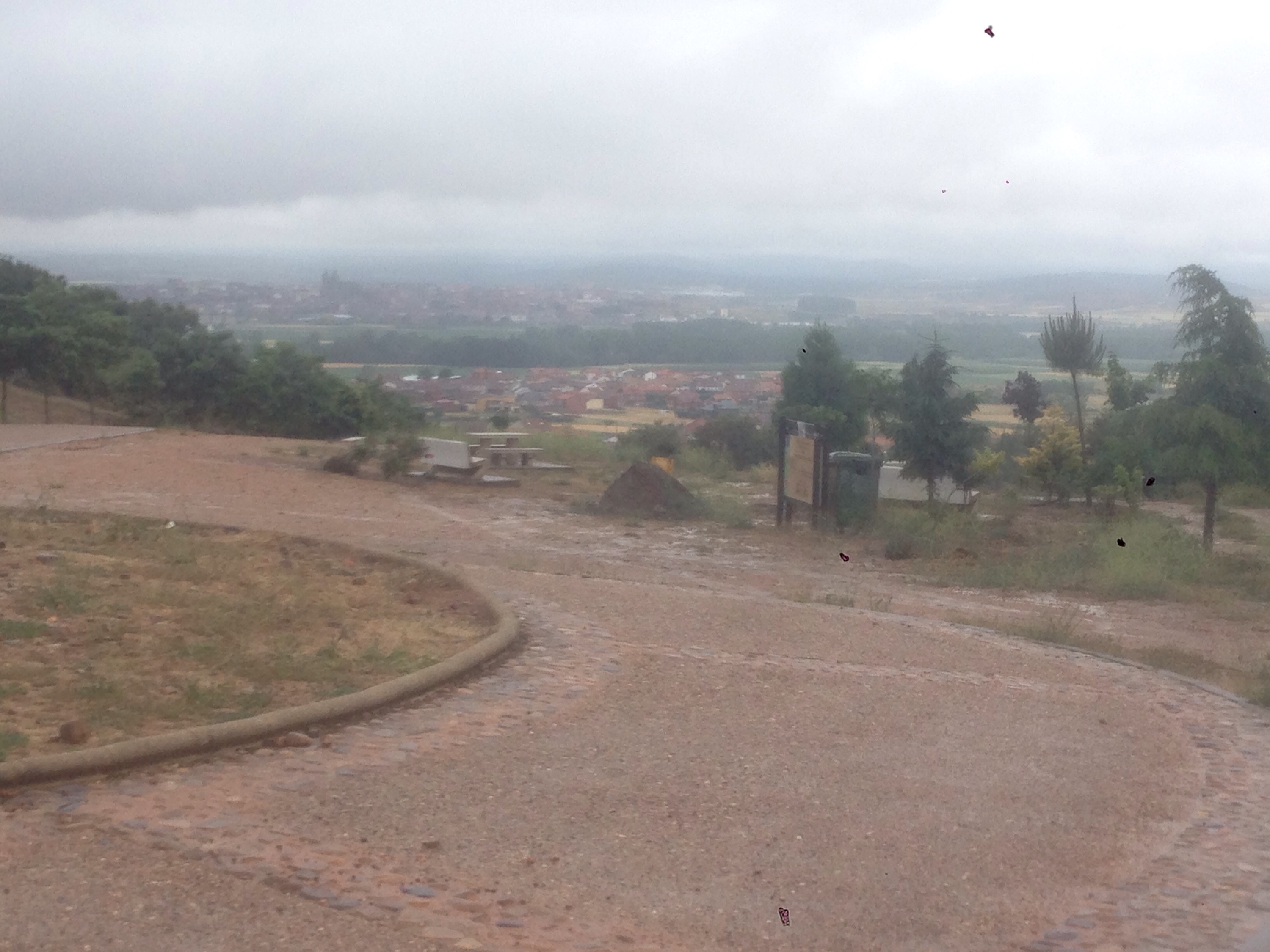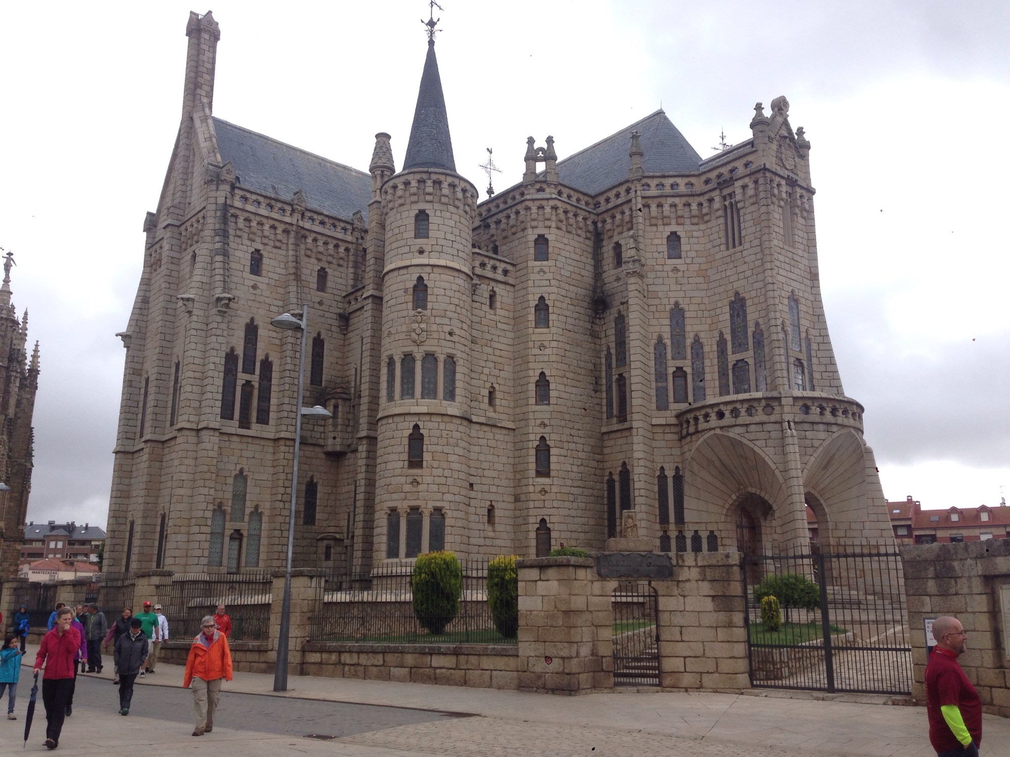 View over Astorga from this last hill was beautiful but the picture doesn’t do it justice. Still raining with thunder.    I’ll get the last drop of wine out of that bottle!  Staying here tonight. Room beautiful till I’d spread my wet clothes around  to dry off.   Gaudies bishops palace.