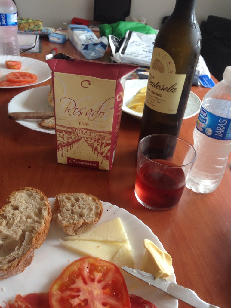 Walk back to Finisterre over the hilltop     Hippy beach ahead as we come back k down to our apartment in time for lunch  lunch at the apartment-  note the rose wine In the carton €0.84 for a litre from the super market- the bottle of white was amougst the most expensive there at €3.99