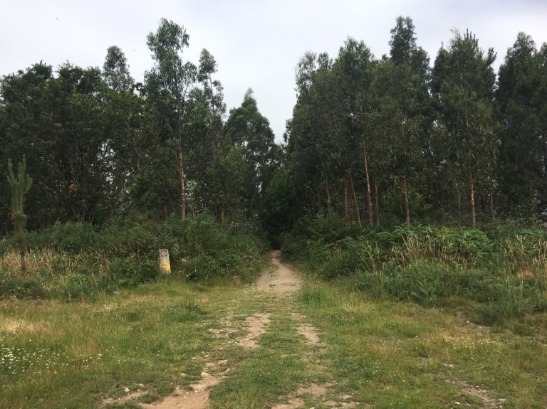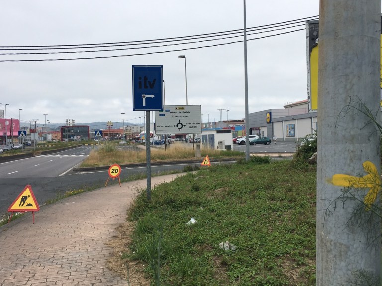 Not yet had breakfast- the path goes to the right (see arrow on lamppost) or do I go off route by a hundred meters to get a Spanish sausage mcmuffin (see the Golden Arches?)