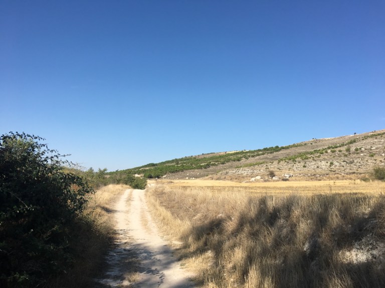Hornillos suddenly appears in the valley below the wheat fields above